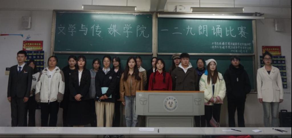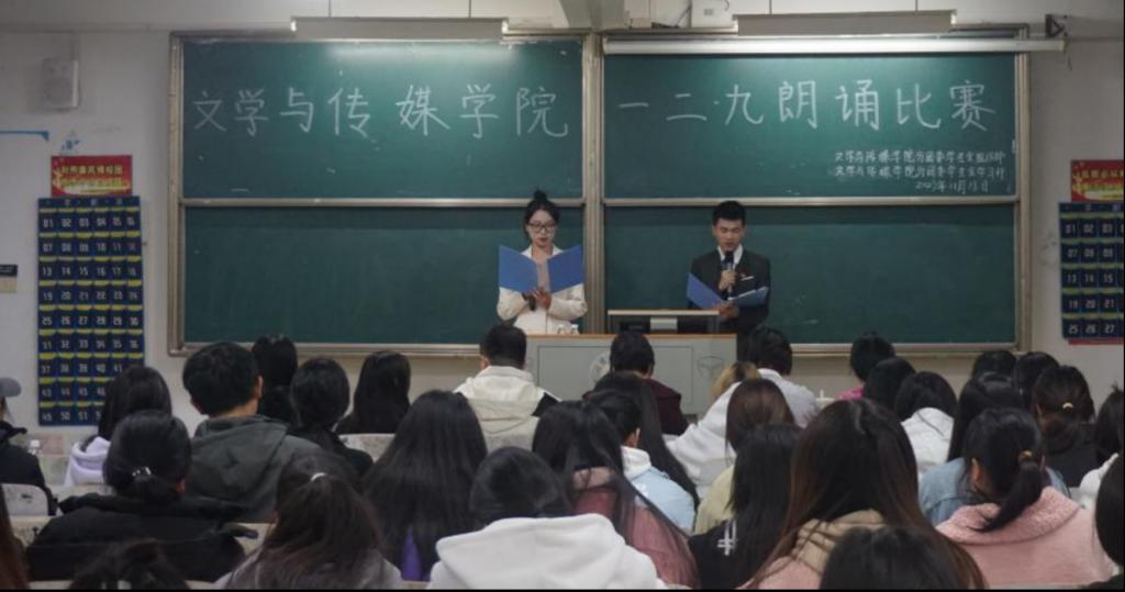 为纪念“一二·九”学生爱国运动88周年,11月18日晚,我院在教学楼A1-305举行了“一二·九”爱国诗歌朗诵比赛。本次比赛以“薪火永相传,青春正激昂”为主题,旨在通过朗诵经典爱国诗歌,弘扬爱国主义精神,引导学生铭记历史,缅怀先烈,传承红色文化。
