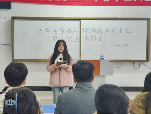 学生会各部门代表进行现场述职,各部负责人围绕本部近期工作重点和创新举措等方面展开汇报,学生会主席程紫露就任职以来学生会工作中存在的问题进行了总结反思。
