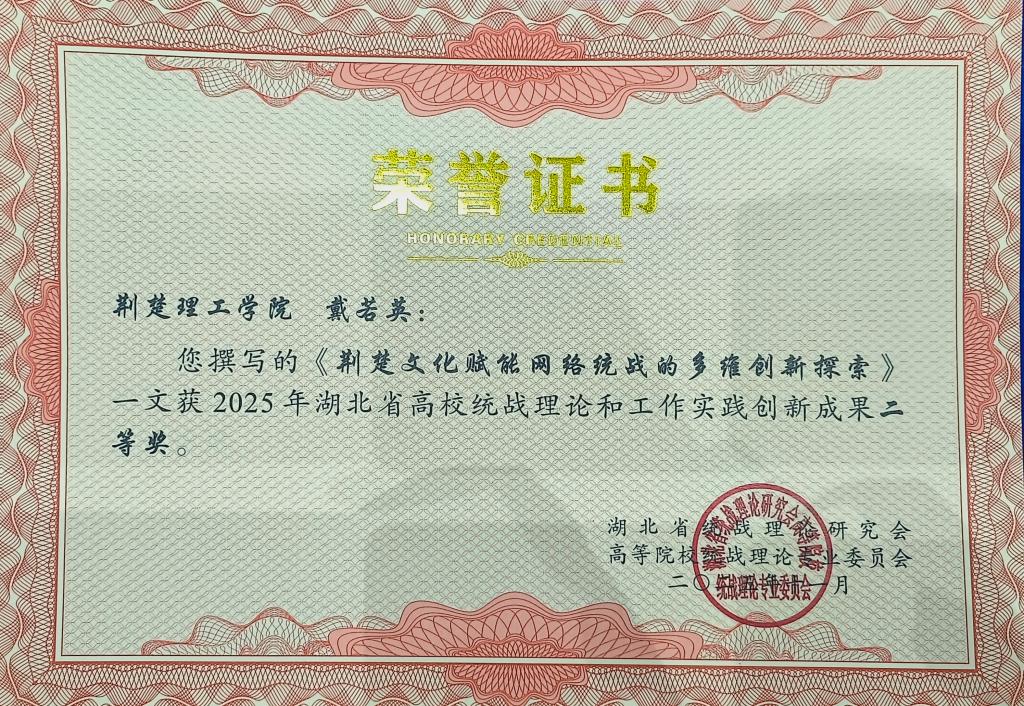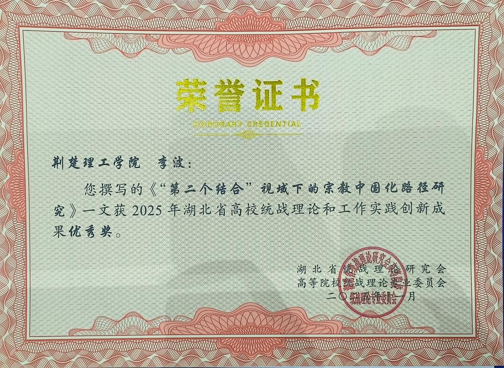 近日,湖北省高校统战理论研究会第40次年会召开,会议对2025年湖北省高校优秀统战理论和工作实践创新成果进行了表彰。我院教师戴若英撰写的《荆楚文化赋能网络统战的多维创新探索》荣获二等奖、教师李波撰写的《“第二个结合”视域下的宗教中国化路径研究》荣获优秀奖。