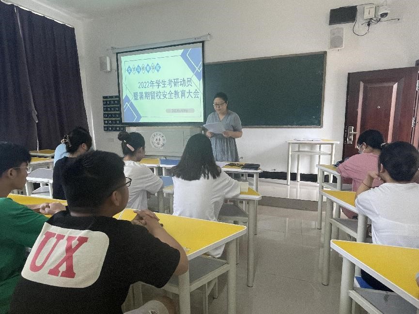为鼓励暑期留校学生认真备考研究生,同时落实学校关于暑期留校学生安全管理工作,6月30日上午,我院在四合院107教室召开了2022年学生考研动员暨暑期留校学生安全教育大会。学院党总支副书记刘清华、辅导员及全体暑期留校学生参加了会议,会议由学工办主任何晓程主持。