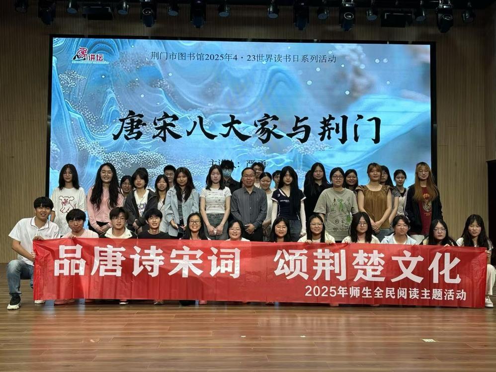 4月26日,在第30个世界读书日的浓厚书香氛围中,文学与传媒学院汉语言文学专业师生齐聚荆门市图书馆,参与“象山讲坛”荆门印记系列文化讲座,探寻诗文背后的地域情缘,感受荆门山水如何激发文豪灵感。