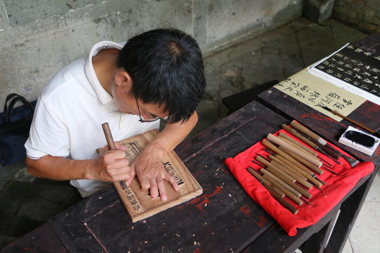 继续走进村落,“蒲公英”志愿服务队一行来到了“苍岚山房”,听老师讲述书房故事,观看老先生演示拓印,雕版见证“耕读传家”传统。修缮后的山房恪守“外观守古、内里更新”的原则。我们队员亲自体验雕版印刷技术,体会陆九渊心学名句。在对村落明清建筑群落的调研中,“谏草传芳”门坊的砖雕、“苍岚山房”的匾额“抬头做人,低头做事”,均在修缮中得到完整保留。