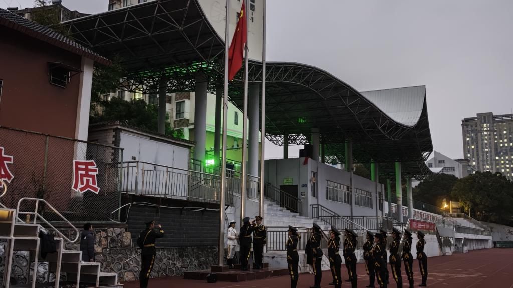 7时许,升国旗仪式正式开始。国旗护卫队护卫着国旗,迈着坚定有力的步伐走向升旗台。在雄壮激昂的《义勇军进行曲》声中,鲜艳的五星红旗迎风舒展、缓缓升起。全体师生肃立行注目礼,齐声高唱国歌,表达对伟大祖国的深切热爱和美好祝福。