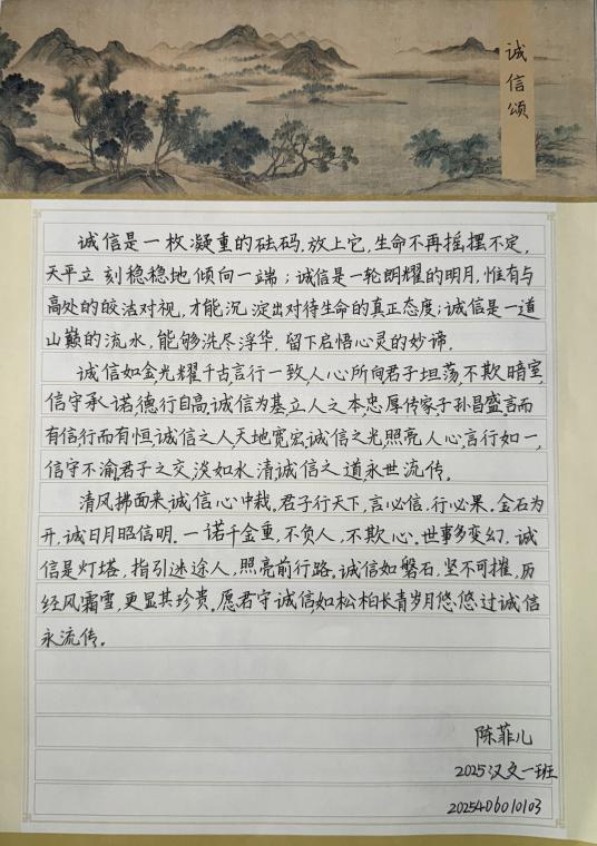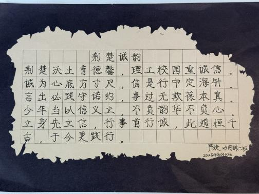 书写是向内的仪式,诚信是向外的承诺。二者结合,让教育有了温度与质感。笔墨虽轻,承载的却是人格的重量;作品虽静,传递的却是鲜活的价值观。通过这一活动,诚信教育从理念转化为实践,潜移默化地影响着学生的价值判断与行为选择。